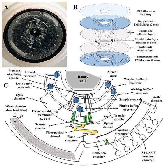 (A) Photograph of the assembled disc. (B) Assembly of the disc consisting of a PET film cover, a top patterned polymethyl methacrylate (PMMA) layer, a MembR valve layer, a bottom patterned PMMA layer, and two double-side adhesive layers. (C) Design of the diagnostic platform including six reservoirs with different solutions, a fibre-packed channel, an aliquoting structure, and six chambers for RNA extraction and RT-LAMP reaction; six different MembR valves, four transfer chambers and waste chambers. Reproduced with permission from [84].