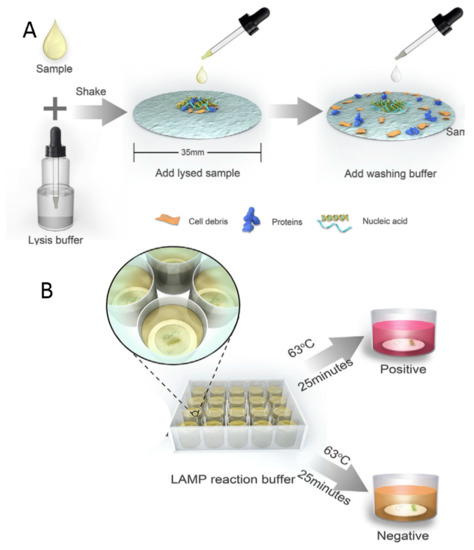 Schematic view of the paper based colourimetric assay proposed by Ye and co-workers: the lysed sample was added to the paper and washed with buffer, while nucleic acid are captured by the paper the contaminant of the lysed sample were eluted with washing buffer by capillary forces (A). Second, the sample adding area of the paper was cut and put in a micro-well for subsequent isothermal amplification. The nucleic acid captured on the glass fibre of the paper was directly used as the template for the high-efficiency LAMP reaction, and the results were visible by the naked eye on the basis of color (rose red positive for or brown for negative) (B) Modified with permission from [84].