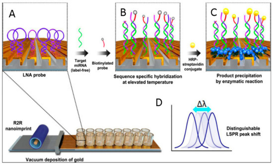 Several other attempts have been made to integrate sensitive detection methods for miRNA quantification. A POC sensing platform for miRNA detection should enable label-free quantification with good sensitivity, real-time response, and high throughput. In this regard, Localized Surface Plasmon Resonance (LSPR) biosensors have attracted large interest, since they can be integrated into Lab-on-a-Chip platforms without the need for complex and sophisticated optical set-ups, unlike other sensitive optical techniques. For example, Na and co-workers proposed a sensitive LSPR-based miRNA sensing system based on flexible plasmonic nanostructures, fabricated by nanoimprinting, enabling single-base mismatch discrimination and attomole detection of miRNAs on real samples. They used a hairpin probe based on a locked nucleic acid (LNA). After hybridization with the specific miRNA, a second probe labelled with an enzyme induced signal amplification, forming a precipitate on the surface transducer through the enzyme reaction (Figure 9). Such a sensing platform may have important applications in POC diagnostics for detecting nucleic acids without the need for gene amplification [89].