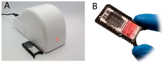 The GeneXpert® by Cepheid (Figure 10) is probably the best-known and most mature POC qPCR system [90]. The GeneXpert I model in particular—that is, the single module instrument—is around 10 × 30 × 30 cm in size, and weighs around 8 kg. The reactions take place on a disposable cartridge, including a sample preparation system, so that the instrument manages an entire sample-to-answer flow, for the supported assays [91,92]. DNA is extracted by sonication-based cell lysis, then purified and mixed with the appropriate lyophilized qPCR reagents, to be eventually analyzed by qPCR. Each disposable cartridge contains one reaction chamber. Fluorescence detection relies on 6-channel optics. Multiple models are available with 1, 2, 4, 16, 48 or 80-module configurations for increased sample throughput.