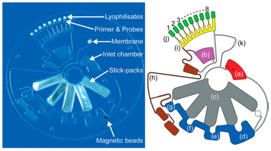 An advancement in ready-to-use diagnostic tests for influenza A H3N2 was recently reported by Stumpf and co-workers, who implemented a “sample-to-answer” lab-on-a-disk platform for completely automated nucleic acid–based detection of respiratory pathogens (Figure 12). Its complex structure comprised microfluidics built with various techniques and materials: PDMS, cyclo-olefin polymer, Teflon associated with soft lithography, CO2 laser, ultra-precision micromilling machine. The circuit could hold the sample and deliver it through a circuit activated by centrifugal forces, applied according to a precise rotational protocol. Liquid buffers for nucleic acid extraction were pre-stored in miniature stick-packs, suitable for long-term storage. The stick-pack also contained frangible seals, which were opened during centrifugation by the liquid pressure reached at very well defined spinning frequency, and thanks to the presence of centrifuge-pneumatic valves. Among prestored reagents, authors included also air dried specific primers, fluorescent and magnetic conjugate probes, and lyophilized RT-qPCR mastermix. Employing two different release frequencies they achieved the on-demand stick-packaged liquid discharge of highly wetting extraction buffers, and the subsequent release of lysis and binding buffer. A strict running protocol was then applied to a prototype Lab-on-a-Disk player, able to finely tune the rotational speed and the applied magnetic field, so that reverse transcription and qPCR with real-time fluorescent readout were performed achieving a LOD down to 75 plaque forming units (pfu) per ml in a time for sample-to-answer of less than 3.5 h. The hardware setup was a 2 kg portable, laptop controlled, POC device [125].