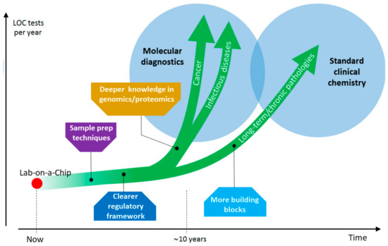 The development of POC diagnostic platforms with such characteristics requires remarkable efforts and a multidisciplinary approach across many technology areas. Below we will discuss some specific applications, as examples of the potentiality of POCs. In particular, we will first review the status of material research. Next, we will examine the most relevant innovative technologies aiming in particular to improve portability and shelf life, and to turn laboratory prototypes into commercial devices for on-field applications. Then, as a case study, we will present a test for drug sensitivity, based on a quantitative real-time polymerase chain reaction (qPCR) POC by STMicroelectronics. Finally, we will provide an insight into the global LOC market to understand the challenges that these technologies have to face to become commercially available.