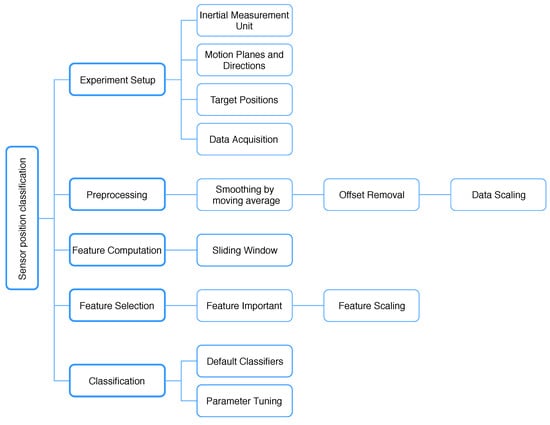 Figure 1 illustrates the data flow from the experimental setups to the classifier optimization. The specifications of the inertial measurement unit (IMU), motion planes and directions, target positions and data acquisition are considered in the experimental setup. In the preprocessing step, the data is smoothed by the moving average technique and having its offset removed. The data is then scaled to an appropriate range for further analysis. After segmenting the data into smaller windows, features are computed for highlighting several data characteristics. From these features, we select appropriate features based on their importance. The default and tuned classifiers are compared to optimize the set of parameters for better results.