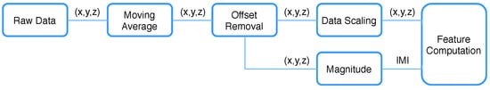 The flow of preprocessing steps is shown in the Figure 3. Each axis of the sensors was smoothed by the moving average technique before having its offset removed. In the next step, the magnitude was calculated from three axes of each sensor. The sources for feature computation include three scaled sensor axes and its magnitude. The three axes are normalized into the range of [−1, 1] because they are equally important to the classification. In contrast, the magnitude of sensors should not be scaled because the dominant side muscles are significantly stronger than the other side [32]. It is also well known that the body is asymmetrical and the symmetry assumption only serves the purpose of simplification [33]. If the magnitude is scaled, the sensors from both sides of a segment are treated equally, which dissents the earlier findings. Therefore, in this experiment, the sensor magnitudes were not scaled regarding the above references.