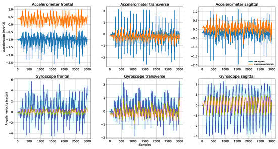 where x is the preprocessed sensor axis and and are the minimum and maximum values for each axis, respectively. Figure 4 shows the raw and preprocessed data.