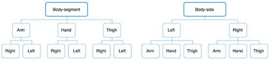 In this approach, the body-segment is classified as the first node. The first output layout contains the arm, hand, and thigh data. The optimized models from node classification are used for discriminating the right and the left sides at the arm, hand and thigh segments.