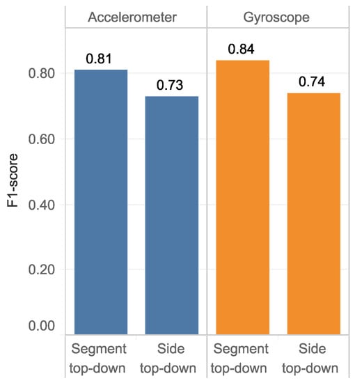 The final results of the hierarchical classification are displayed in Figure 7. The body-segment top-down classification provides the best performance using the gyroscopes (0.84) and the accelerometers (0.81), correspondingly. Similarly, in the side top-down classification, the performance based on gyroscope is slight better than accelerometer (0.74 and 0.73, respectively).