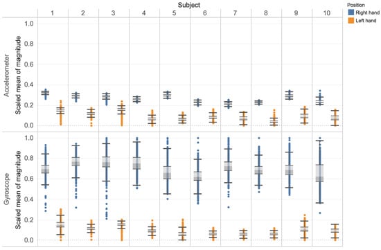 The Figure 8 shows the boxplots of the right and left hands for all the subjects. Although there are ten subjects participated in this experiment, the result shows that this is a promising approach for on-body sensor classification. Furthermore, this result confirm the finding that for the right hand-preferred people, the dominant hand is stronger than the non-dominant hand. As the result, in this case, the right hand generates greater acceleration and angular velocity than the left hand. However, as stated in the work [32], there is no significant differences were observed between dominant and non-dominant hands in left-handed participants. Therefore, further investigation on the left-handed participants should be carried out in the future together with the increase of subjects for generalizing the conclusion.