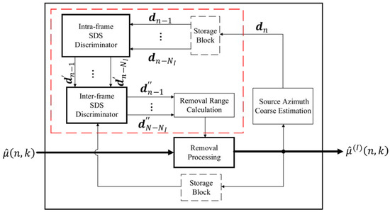 | Input: , where , Output: , where , ► is a set of estimated SDS azimuths in the (n − i)th frame ► is the number of SDSs in Count the number of DOA estimates of all history frames and record as 1. for i = 1 to do 2. for j = 1 to do Count the number of DOA estimates of all history frames locating in [ − , + ] and record as ► is the removal range threshold 3. if It means that there are enough DOA estimates belonging to azimuth corresponding sound source and the sound source is judged as SDS 4. then, 5. else 6. Set as an illegal element: 7. end if 8. end for 9. Delete the illegal elements in the set and form vector , 10. end for 11. Output: |