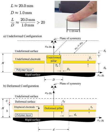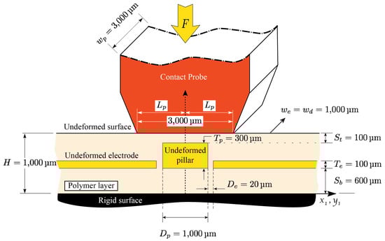 A schematic showing the detailed geometry of the fabricated sensor in [] is shown in Figure 5. As shown, through a special microfabrication process, conductive layers (electrodes and pillar) are embedded into the polymeric layer of initial thickness H = 1000 m. The conductive and dielectric layers have out-of-plane width  = 1000 m. The electrodes and pillar are of initial thickness  and , respectively, and are placed at  from the bottom surface of the sensor. The initial electrode gap of  is introduced between the electrodes and pillar. The pillar has a total in-plane width of  = 1000 m making the total distance between the electrode and the symmetry plane to be . Experimental tests are performed by applying a vertical displacement to the sensor using a  probe and reading the capacitance as well as the reaction forces [].