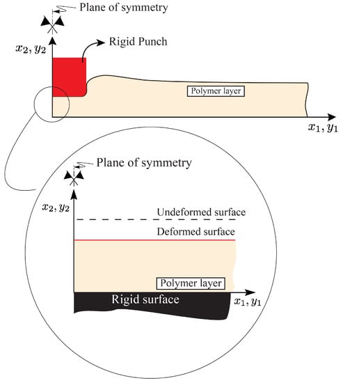 where  is the out-of-plane punch width,  is the effective contact length and is given by Equation (9),  is the stretch ratio in the -direction on the top surface of the polymeric layer,  is the shear modulus,  is given by Equation (4), and  is given by Equation (7) [].
