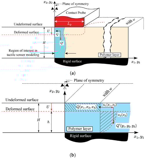 A schematic of a boundary value problem solved in [,] is shown in Figure 3. More specifically, a schematic of an infinitely long layer of finite thickness H compressed under the application of a finite flat punch of half-length  is shown in Figure 3a. The region of interest in the tactile sensor modeling in the vicinity of the symmetry plane and far from the punch edges is highlighted. Consistent with the figure, the mechanics of the highlighted region, whose schematic is magnified in Figure 3b, can be modeled by considering a long layer of finite thickness H compressed uniformly under the applied displacement U. Provided the contact, loading, and material are uniform in the  direction, the problem can be modeled under the plane strain condition. The two-term Mooney-Rivlin (M-R) constitutive response is used to model the elastomeric layer [].