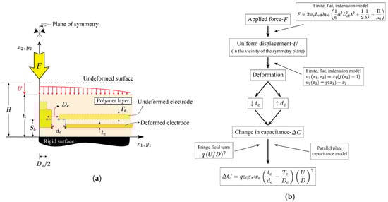 In the proceeding sections, the large deformation mechanics model developed in [,] is combined with an enhanced parallel plate capacitance model accounting for the fringe field as well as saturation effects to develop a tactile sensor model capable of predicting the applied force as a function of change in capacitance over the entire sensing range. The above process is summarized in the flowchart shown in Figure 4b.