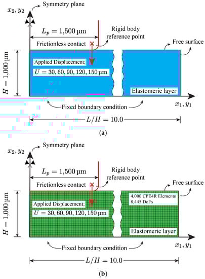 In accordance with the fabricated sensor geometry depicted in Figure 5, the discretized domain with associated boundary conditions shown in Figure 6 is used to perform the FE simulations. As shown in the figure, a 2-dimensional plane strain model is used. By employing symmetry boundary condition at , only the right half of the polymeric layer is modeled. Initial layer thickness is set to H = 1000 m. To ensure the infinite layer assumption, the aspect ratio of length to height , resulting in total length of , is chosen. Fixed boundary condition is used for the bottom surface of the polymeric layer at . The punch is modeled as an analytic rigid body. The motion of a rigid body in Abaqus is governed by the motion of a single node, known as the rigid body reference node. Therefore, the prescribed displacements are applied to this node. More specifically, consistent with the experimental tests carried out in [], increments of  vertical displacements up to  are applied to this node while keeping the horizontal displacement at zero. Also, as shown in Figure 6, to alleviate the convergence difficulties associated with the sharp corner of the rectangular punch, the punch’s corner is rounded accordingly.