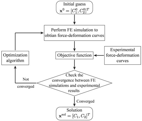 The inverse analysis starts with the initial guess of the M-R material constants, . It then, performs the FE simulations using the above parameters, compares the results with experimental data points, and uses the optimization algorithm to iteratively update the solution until the FE and experimental results converges. The optimization procedure is summarized in the flowchart shown in Figure 7.