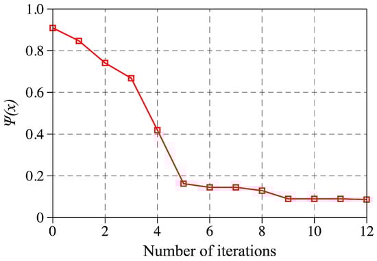 The objective function given by Equation (16) evaluated and plotted against the number of iterations to show the convergence behavior of the inverse problem employed in this study to find the M-R material parameters.
