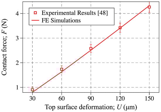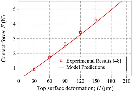 Using the parameters obtained by the inverse analysis, given in Equation (18), the contact force is plotted against the top-surface deformation and compared to the experimental results in Figure 9. More specifically, the discrete points are showing the experimental results reported in [], while the solid line is showing the FE predictions using the M-R material parameters obtained through inverse analysis. As shown, the FE simulations are in great agreement with the experimental measurements, which indicates that the M-R material parameters given in Equation (18) captures the response of the PDMS layer used in the sensors fabricated in [].
