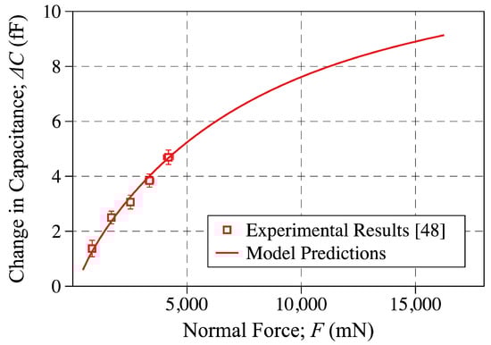 As already mentioned and consistent with [], the  term is introduced in the change-in-capacitance formula obtained by the parallel plate capacitance model to account for the fringe field and saturation effects. By using the experimental change-in-capacitance measurements and the non-linear curve fitting the above parameters were determined to be  and . Using the above parameters, the change-in-capacitance predicted by the model is plotted against the applied force and compared to the experimental results in Figure 11. In doing so, the applied force and change in capacitance are calculated using Equations (10) and (11), respectively. As shown, great agreement is found to exist between the model predictions and experimental measurements reported in []. It is worth noting that while the experimental results are reported for displacements of up to  [], the model predictions shown in Figure 11 are obtained for top-surface deformation levels of up to .