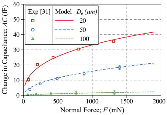 The change-in-capacitance plotted against the applied force. The discrete points are showing the experimental measurements reported in [], while the solid line is showing the modeling results obtained in this study. The model predictions are reported for  and .