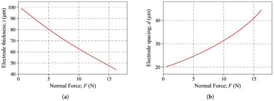 To further understand the physics of the deformation, the electrode thickness and spacing is plotted against the applied force in Figure 13a,b, respectively. As expected, the electrode thickness decreases and the electrode spacing increases during the deformation.