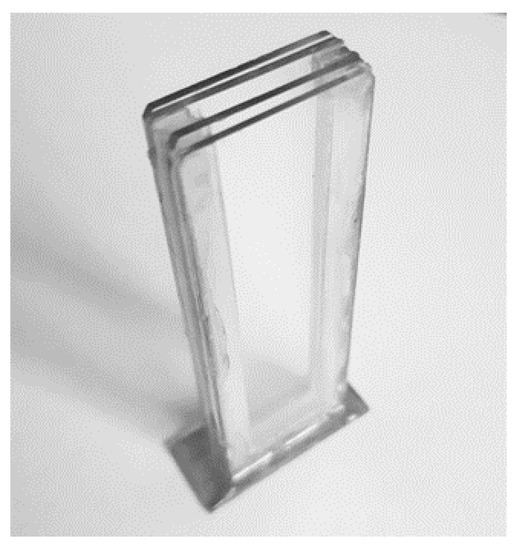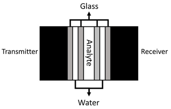 For the frequency and transient response tests, the following protocol was used. First, a syringe is used to introduce distilled water into every liquid layer of the phononic crystal shown in Figure 2. Then glycerol was applied as a coupling means between the ultrasonic transducers and the outer glass layers. Without a coupling agent, the signal is mostly attenuated due to the imperfect match of the layers and the air in between. Then connect the transmitter to the Tektronix generator and the receiver to the AD8302 integrated circuit together with a reference generator with a constant gain. Run the python program and watch if the signal is correct. When the sensor and instruments are fully operational, the analyte was carefully deposited in the central layer of the crystal. Each measurement was taken three times, and the phononic crystal was carefully cleaned and dried before each measurement. The tests were performed under a controlled room temperature since changes in temperature could affect the speed of sound of the materials and influence the results of the study.