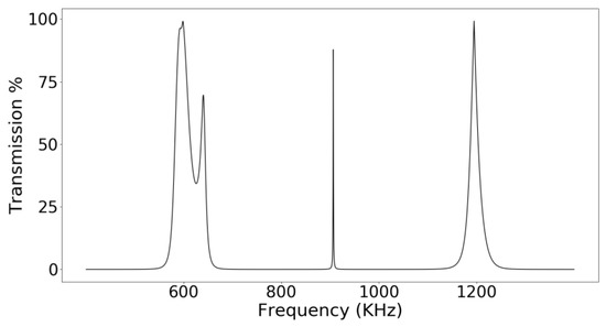Different sensing applications have been proposed using 1D phononic crystals. Some of the current measures used to characterize phononic crystal sensors are the frequency of maximum transmission, the peak amplitude, and the peak bandwidth [11,12,13,14,15,16,17].