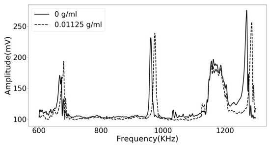 Experimental results of the phononic crystal sensor using distilled water (solid line) and a lithium carbonate solution with a concentration of 0.01125 g/mL (dashed line).