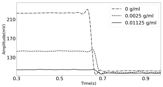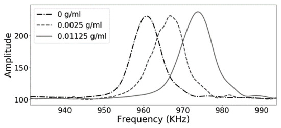 In Figure 6, the transient response of the acoustic waves traveling across the phononic crystal sensor at three different concentrations is shown. The system was set to a fixed frequency of 960 KHz, frequency of maximum transmission when using distilled water as the analyte, and the gain was recorded against the time. The generator system is suddenly turned off, and the transient response is obtained. The concentration-dependent damping observed in Figure 6, is related to the displacements in the frequency of the resonant transmission feature located in the middle of the bandgap. Because the amplitude of the starting signal is higher when distilled water is used as the analyte (0 g/mL), the transient response is more extended, and the slope of the signal is more inclined. When the lithium carbonate concentration increases, the initial amplitude is very low, resulting in a shorter decay time and a less steep slope.