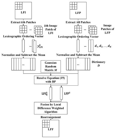 The four main steps of low-frequency sub-images fusion can be briefly summarized as: (1) The and sub-images are separately divided into small and partially overlapped image patches. All the image patches are normalized before the mean of each patch is subtracted. (2) All patches from are utilized for the dictionary composition. (3) For each patch from , compressed sensing is performed by solving Equation (18) to acquire the reconstructed patch. (4) The patch is fused using a local difference weighted algorithm.