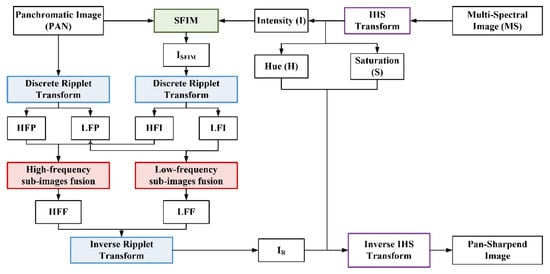 In recent years, the shift invariant ripplet transform (RT) [] has been proposed and extensively adopted in feature extraction. RT is able to represent 2D singularities (e.g., edges and textures) more efficiently at multiple scales and in multiple directions along a family of curves. Several studies [,,] demonstrate that RT is superior to wavelet- and curvelet-based MRA transforms in terms of the effectiveness and efficiency of edge and texture extraction and reconstruction. In view of this, an IHS-based pan-sharpening method combining the high spectral fidelity of discrete ripplet transform (DRT) [] and desirable local information preservation of compressed sensing [,] is proposed in this paper. Specifically, IHS transform is firstly performed on MS images to obtain the intensity component. Then, smoothing filter-based intensity modulation (SFIM) [] is introduced to modulate spatial information contained in the intensity component without altering its spectral characteristic. The ripplet transform [] is implemented on the intensity component and the PAN images to extract high-frequency (HF) and low-frequency (LF) sub-images. Subsequently, compressed sensing technique is applied to reconstruct the LF sub-images. Various fusion rules are adopted for the HF sub-images and LF sub-images according to their specific characteristics. The local variance algorithm [] and local difference weighted algorithm are respectively selected as the fusion rules for HF and LF coefficients. Finally, the pan-sharpened image is obtained by inverse ripplet transform and inverse IHS transform. Experiments on WorldView-2, Pleiades and Triplesat datasets corroborate that the proposed method ensures superior spectral fidelity compared to several state-of-the-art approaches.