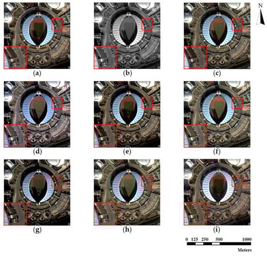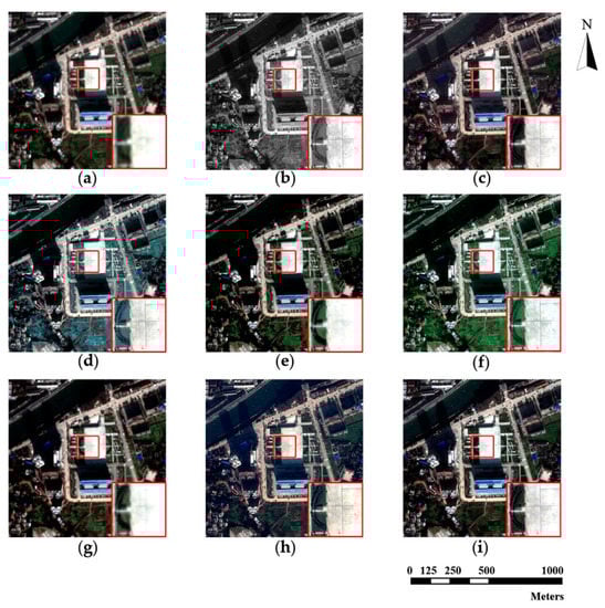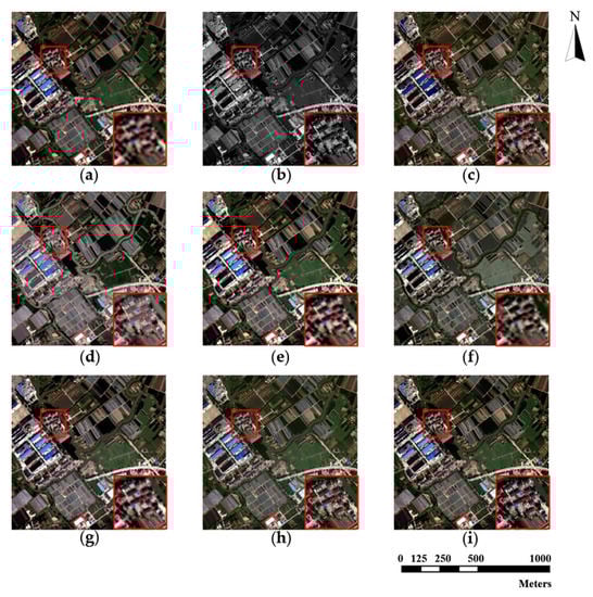 WorldView-2 original images and fusion results of different methods. (a) Original multispectral image (MS); (b) Original panchromatic image (PAN); (c) Gram-Schmidt [] pan-sharpened image (GS); (d) Adaptive IHS [] pan-sharpened image (AIHS); (e) Wavelet transform and sparse representation method [] pan-sharpened image (WT-SR); (f) Wavelet-based IHS [] pan-sharpened image (WT-IHS); (g) Curvelet transform and independent component analysis [] pan-sharpened image (CT-ICA); (h) Ripplet transform based on injected details [] pan-sharpened image (CSI); (i) pan-sharpened image by the proposed method (proposed).