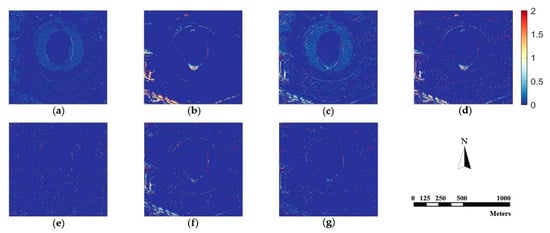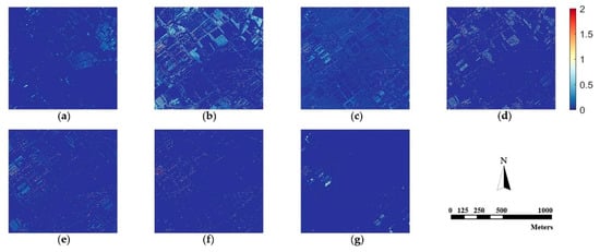 The difference image between the fused images and the referenced MS image for WorldView-2 data. (a) GS; (b) AIHS; (c) WT-SR; (d) WT-IHS; (e) CT-ICA; (f) CSI; (g) proposed.