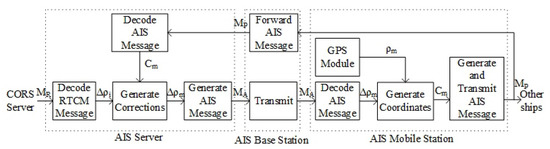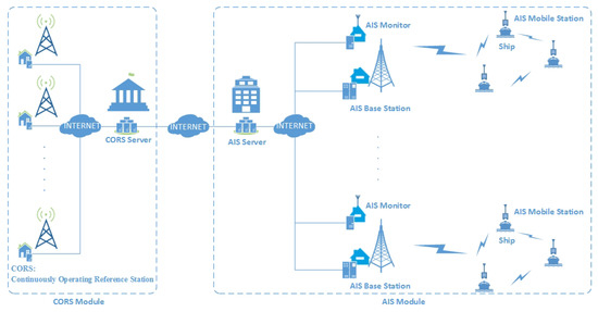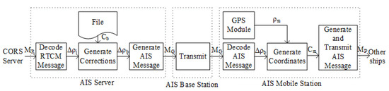 The conceptual model of the differential correction approach for AIS mobile stations comprises two parts: the CORS module and the AIS module, as shown in Figure 1.