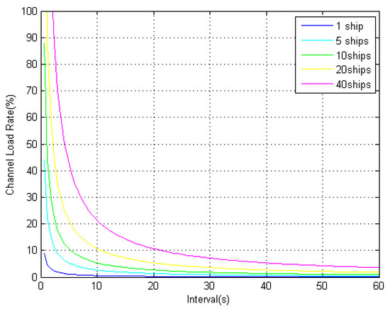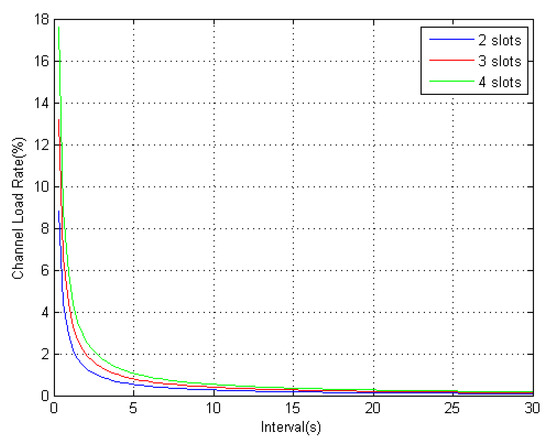 According to the regulation of AIS message type 17, when the number of transmitted satellites is not more than 10, the differential corrections broadcast by the AIS base station occupies two time slots. When the number of transmitted satellites is in the range to 19, the differential corrections occupies three time slots. The relationship between the AIS channel load rate and the differential message broadcast interval is shown in Figure 4.