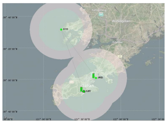 The DLMU-CORS network established on the coast of Dalian City is selected as the experimental basis for providing the differential corrections. The network has three reference stations, located at the Dalian Maritime University, Mianhua Island, and Changxing Island, respectively. Each CORS station passes its own observation data to CORS server which further distributes the data via the network. The distribution of the reference stations and the service range of each station are shown in Figure 6.