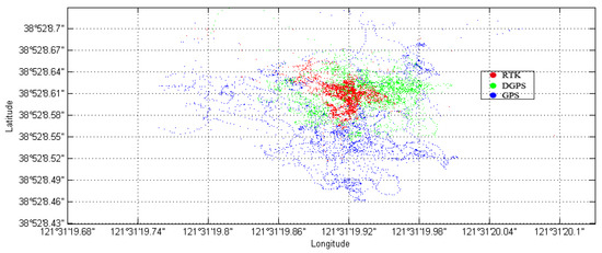 The static experiment was tested on the ship at anchor. The test lasted 50 min with a sampling interval of one second. The positioning results are shown in Figure 7. The red marks are the results obtained by using network RTK high-precision positioning. It can be seen from the figure that the ship is not completely stationary due to the impact of the sea-air current and the wind direction, which caused the boat to move about its anchored position. The blue dots represent the positioning obtained using the existing single-point positioning. The green dots indicate the positioning result with the aid of the differential correction approach using broadcast binary messages. Clearly, the positioning error of this method is much smaller than that of single-point positioning and is closer to the value of RTK high-precision positioning.