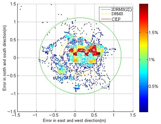 The dynamic positioning errors are shown in Figure 10 in which the horizontal vertical axis represents the positioning error in longitude; the value of the mean and the standard errors in that direction are −0.333 m and 0.82 m, respectively. The vertical axis represents the positioning error in latitude; the value of the mean and the standard errors in that direction are −0.564 m and 0.96 m, respectively. The color of the points changes from red to blue, which indicates that the frequency of the points tends to reduce. The dynamic positioning accuracy of is 2.54 m (2 DRMS).