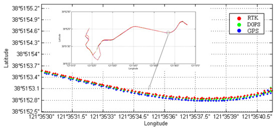 The dynamic test aimed to analyze the positioning accuracy of a traveling ship. The speed of the ship was about 20 knots. The test lasted 40 min and the sampling interval was 1 s. The dynamic positioning results are shown in Figure 9. Blue points indicate the results from single-point positioning and green points indicate the positioning results with the aid of differential corrections provided by our method. The result of high-precision RTK positioning is indicated by red points.