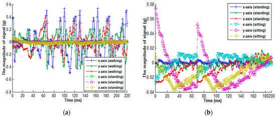 Comparison of the magnitude of a tri-accelerometer among three different activities. The accelerometer has sensor readings from three axes, i.e., x-axis, y-axis, and z-axis. (a) Comparison of walking and standing; (b) Comparison of standing and sitting.