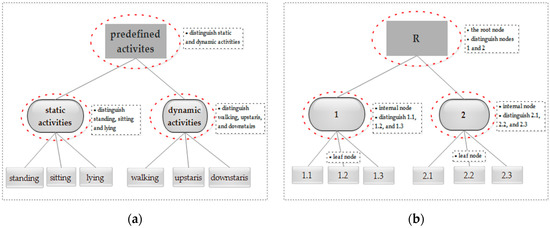 These six basic human activities are also widely used in many other research studies [4,10,11]. According to the movement state, we can group standing, sitting, and lying into static activity, and group walking, going upstairs, and going downstairs into dynamic activity, and we can then recognize activities within each group. This helps to find a better decision boundary and enables the classifier to better discriminate similar activities. Figure 2 presents the proposed hierarchical activity recognition framework, which is basically a tree structure. Each internal node of the tree represents a group of activities with similar characteristics, each leaf node indicates a specific activity label, and the root node contains all the predefined activities of interest. Specifically, Figure 2a presents the hierarchical structure of the six basic activities, and Figure 2b is the abstract form of the corresponding hierarchical structure.
