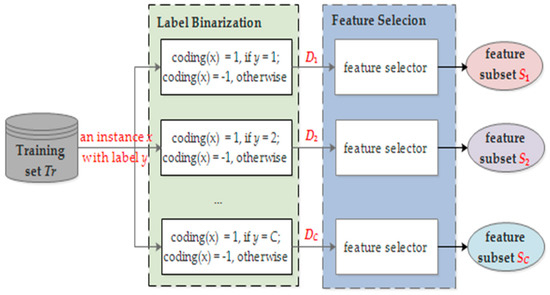 In fact, different activities are generally represented by different subsets of features. Different from the class independent feature selection, class dependent feature selection finds an optimized feature subset for each activity and the obtained subsets are probably different from each other. The core idea of class dependent feature selection is to convert a C-class classification setting into C (C ≥ 3) two-class classification cases and conduct feature selection for each binary classification problem. Specifically, given a training set D, for the k-th (1≤ k ≤ C) classification problem, we obtain its training set Dk by coding the label of an instance x with a label binarization operation: label x with +1 if its original label is class k; otherwise, label it with −1. Then, we obtain C training sets {D1, D2, …, DC} associated with the C binary classification problems. Afterwards, feature selection is applied to Dk to obtain the optimal feature subset Sk. In this step, class independent feature selection methods can be used. Finally, for a C-class classification problem, we obtain C feature subsets {S1, S2, …, SC}, each of which corresponds to a specific class. For the example in the previous sub-section, class dependent feature selection methods generate three feature subsets, i.e., {F1}, {F2}, and {F3}, and three classifiers. Since classifiers are trained with different feature subsets, there will be no noise for the classifiers and a better classification performance is expected. Figure 3 presents the scheme of class dependent feature selection, in which label binarization is performed to get C different training sets and returns C feature subsets {S1, S2, …SC}.