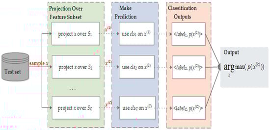 The scheme of classifying a test sample with the class dependent feature selection method. It first projects the test sample over different feature subsets, then uses the trained classifiers to make predictions, and finally determines the predicted label according to the maximal probability rule.