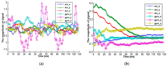 As for the wearable devices, in this study, a Samsung Galaxy S II smartphone equipped with a tri-axial accelerometer and a tri-gyroscope is used to collect raw sensor signals associated with different activities. The used smartphone, configured with a 1.2 GHz processor, a memory with 1 GB, and a Li-Ion battery with 1650 mA, can work continually for several hours, which satisfies the experimental requirements. The acceleration is obtained with the STMicroelectronics K3DH 3-axis accelerometer (measurement range ± 2 G, resolution = 0.0625, G is the gravitational constant) and the angular velocity is measured by the K3G gyroscope sensor (maximum range 8.7267, resolution = 0.0003). A gyroscope can measure the angular velocity that is generated by itself-rotation, and an accelerometer can obtain the magnitude and direction of a moving object. Figure 6 presents the sensor readings of a gyroscope and an accelerometer when an individual is going upstairs and sitting, from which we can view the significant difference between their signals. The x-axial represents time and the y-axis indicates the magnitude of different sensor signals. Specifically, the accelerometer has three axes (acc_x, acc_y, and acc_z) and the gyroscope has three axes (gyro_x, gyro_y, and gyro_z).