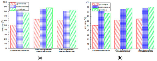 For wearable sensor-based human activity recognition, the tri-axial accelerometer and tri-axial gyroscope are two commonly used sensing units, but there are few comparative studies about their performance in activity recognition. Figure 7 shows the accuracy comparison of the accelerometer, gyroscope, and the joint use of the accelerometer and gyroscope. The x-axis represents different feature selection methods, and the y-axis indicates the classification accuracy. First, we observe that, compared with the gyroscope, the use of the accelerometer generally obtains a better recognition performance. For example, for the non-hierarchical method without feature selection, the use of the accelerometer achieves an accuracy of 81.07%, while the accuracy of using the gyroscope is 50.80%; for the hierarchical method, the accuracies associated with the gyroscope and accelerometer are 62.44% and 85.61%, respectively. For the hierarchical method with class dependent feature selection, the use of the accelerometer obtains an accuracy of 88.29% compared to 64.91% for the gyroscope. This indicates that if we only choose one sensing unit, the use of an accelerometer is superior to that of a gyroscope. Second, directly fusing sensor data from the gyroscope and accelerometer cannot guarantee the accuracy improvement in activity recognition. For example, for the non-hierarchical method, using the accelerometer obtains an accuracy of 81.07%, while the accuracy of using both the accelerometer and gyroscope decreases to 76.99%; similarly, for the hierarchical method, in comparison to the 76.86% accuracy that is obtained using the accelerometer and gyroscope, the accuracy of the accelerometer is 80.90%. This indicates that redundant and irrelevant information probably exists among the features extracted from the accelerometer and gyroscope data. Third, with the aid of a feature selection method, the joint use of the accelerometer and gyroscope consistently obtains a higher classification performance than that of just using the gyroscope or accelerometer. For example, for the non-hierarchical method, with the help of the class independent feature selection method, the use of both the accelerometer and gyroscope obtains an accuracy of 88.16%, which outperforms that of the accelerometer (an accuracy of 85.61%) and the gyroscope (an accuracy of 62.95%); after using the class dependent feature selection method, the accuracy of sensor data fusion is 83.61%, while the accuracies of using the accelerometer and gyroscope separately are 80.49% and 61.62%, respectively. This indicates that the accelerometer and gyroscope can provide complementary information to each other and that redundant information also exists among the extracted features.