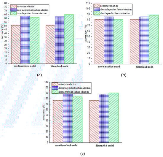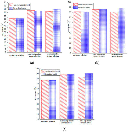 Performance comparison of using different feature selection methods in the case of the non-hierarchical model and hierarchical model. (a) Performance obtained using the gyroscope data; (b) Performance obtained using the accelerometer data; (c) Performance obtained using the accelerometer & gyroscope data.