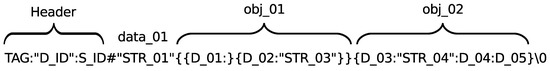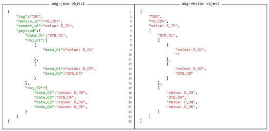 A message can quite naturally take the form of a JSON object, where keys, or names are used to label the values. A value of course can be a native data object or another map, or vector, making it possible to have extremely complex structures. A fundamental observation is that the keys in such an object are redundant when the structure of the message is known. Hence, the message can easily be replaced with a much more compact (in general) vector form, where the position of a value implicitly defined is key. Figure 5 shows two such representations side by side. In the vector representation, missing elements must be represented by empty values to ensure each value is in the correct location of the vector. For example in Figure 5 the missing data element in the first vector object of the vector obj_01 is represented by an empty string.