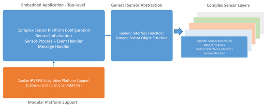Figure 2 depicts the general structure of the Cookie node from the perspective of the processing layer. In orange, the vertical connectors that provide a common interconnection among the modular layers and allow the data and power signals exchange throughout the whole platform (in blue and red respectively). Green boxes represent the integration of different independent complex sensor layers considering the proposed digital interfaces, although the use of analog signals is not restricted; the gray box illustrates the communication layer. In the center of the diagram, we show the main processing element that supports the implementation of the complex sensor management system. It relies on an embedded software that follows the layer-based architecture of the modular platform, so that the processing and data fusion of the complex sensors is developed upon the platform abstraction API, the software controllers, and the Cookie support libraries.