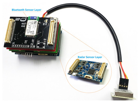 The result of the Cookie complex sensor integration is shown in Figure 9, where the Sensor node comprises the two designed layers plus the power supply, processing based on an 8-bit 8051-based low-power ADuC841 microcontroller from Analog Devices (Norwood, MA, USA) and WSN wireless communication (which includes a IEEE 802.15.4 compliant CC2420 radio chip from Texas Instruments) modular layers. It is important to highlight at this point that the combination of the modular features of the Cookie platform with the characteristics of the wireless networked system allows a straightforward modification of the deployment topology in accordance with the requirements of the target area. It means that one Cooke node can be composed of both complex sensors and placed in a strategic point of the traffic zone to be monitored, and the network can be diversified with one additional node with only BT scanner for data filtering and redundancy checking, and so on.