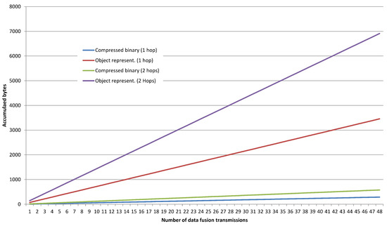 Comparison of network overhead for two different types of data fusion transmission formats.