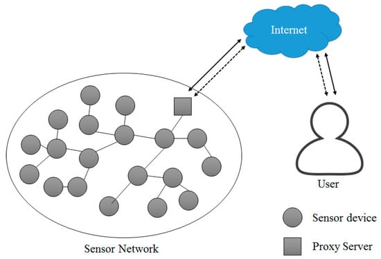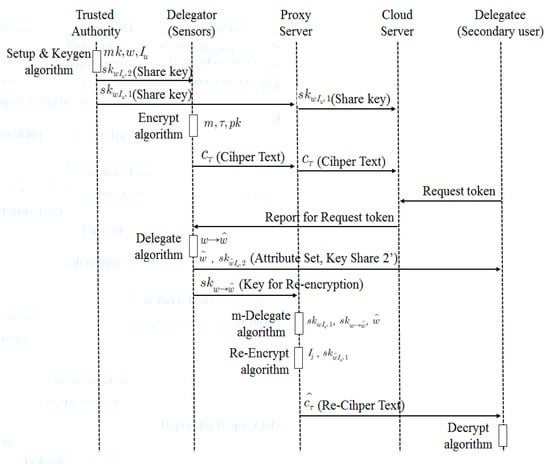 - A Trusted Authority (TA) defines system parameters using Setup (k) algorithm and creates the public key (pk) and the master key(mk). In addition, it creates two private key shares skwIu,1 and skwIu,2 relating to Attribute w and Public Key Iu and sends skwIu,1 to a proxy server and skwIu,2 to a sensor or a data owner, using KeyGen (mk, w, Iu) algorithm.